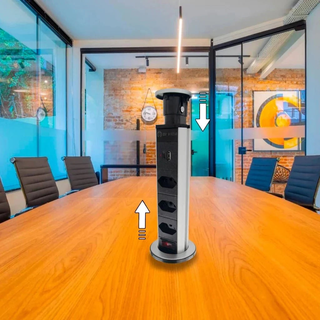 Se acabaron las extensiones esparcidas o múltiples adaptadores. La torre retráctil fue diseñada para centralizar todas tus conexiones en un único punto, sin comprometer la estética del ambiente.